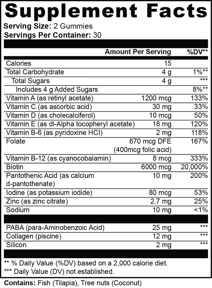 Answer 1: The gummies contain essential vitamins and minerals, including Biotin, Vitamins A, C, D, E, Zinc, Iodine, and Collagen. These ingredients work together to support the health of your hair, skin, and nails.